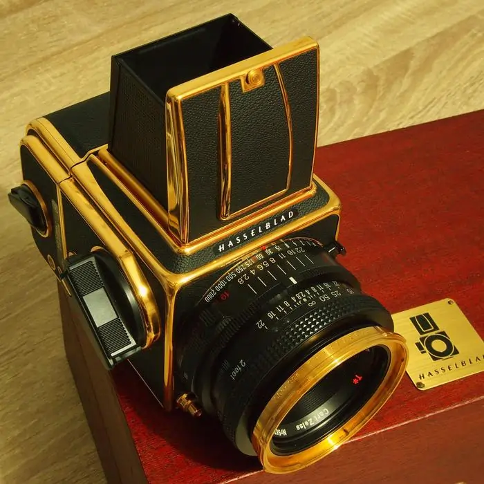Edisi khusus Hasselblad yang berlapis emas 24 karat dan dibalut kulit eksotis ini dibuat untuk memperingati ulang tahun perusahaan. Kamera ini bukan hanya cantik, tapi juga sepenuhnya berfungsi. Harga lelangnya pernah mencapai lebih dari Rp 1,5 miliar.